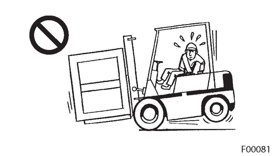 - Slowly operate the lift truck when picking up or placing a long or wide load, or when turning with such a load.