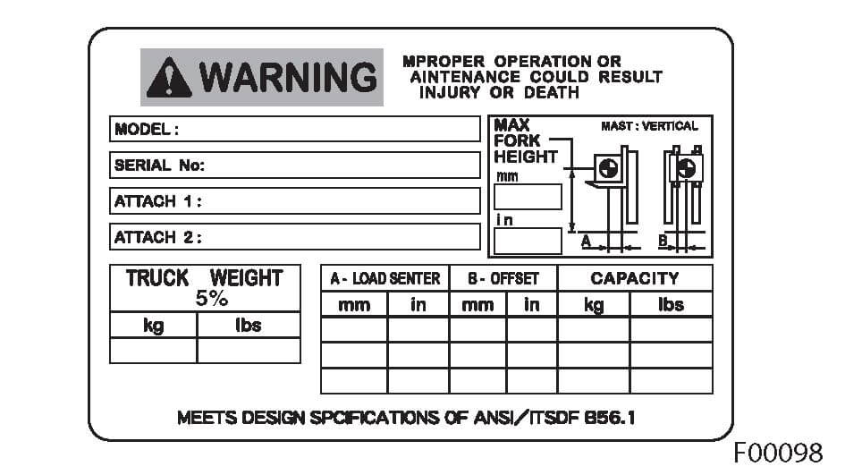 Keep in mind that, unless otherwise indicated, the capacity shown on the forklift’s capacity plate is for a standard lift truck with standard backrest, forks and mast, and no special-purpose attachment. In addition, the capacity presumes the load center is no further from the top of the forks than it is from the face of the backrest.